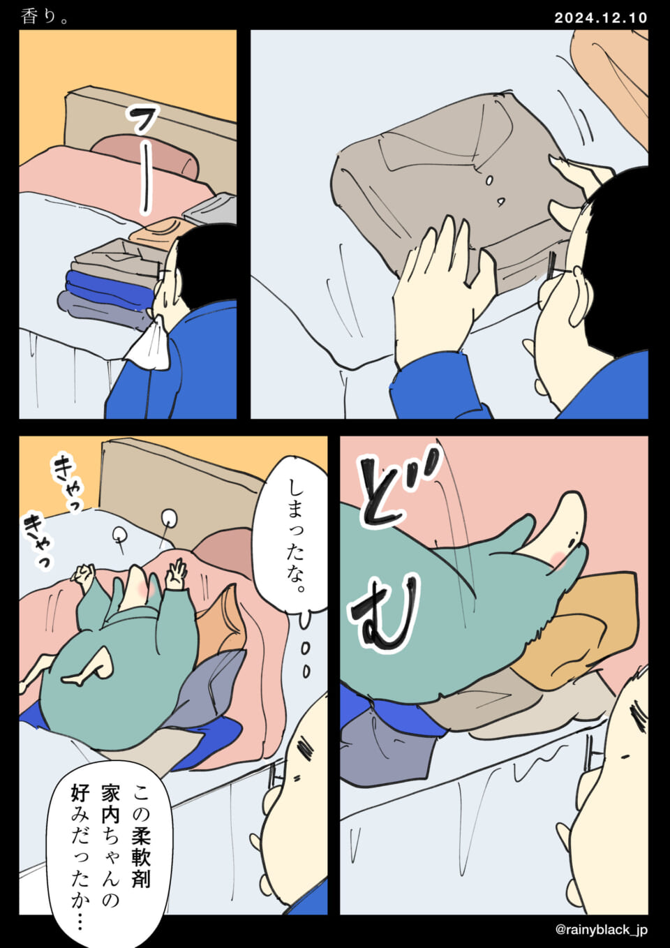 男が誰かの服に顔を近づけて香りを確認している。すると服の束の中から小動物が現れる。この動物は柔軟剤の香りが気に入っている様子で、服の上でくつろいでいる。男はその様子を見て、今使っている柔軟剤がこの小さな家内の仲間に好まれていることに気づく。
