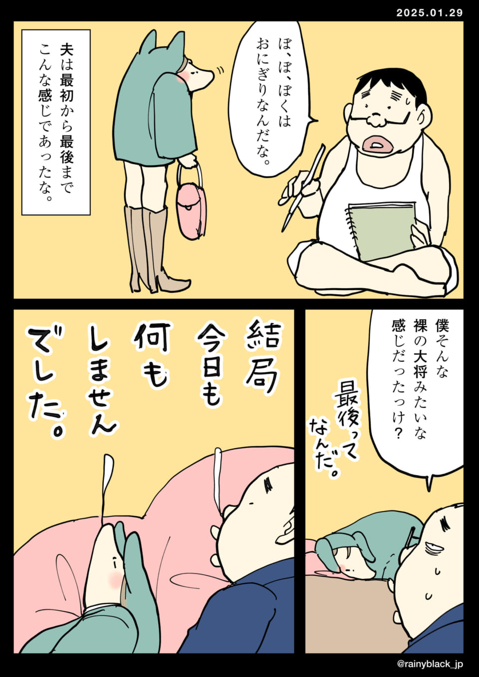 「その足は現実から脱兎のごとく逃げるため。」2025 .01.29家内ちゃんは初め白くてふわふわな生き物だったが、何度か会ううちに変形し、「マグマックス」というゲームの進化途中のような姿に変わった。一方、夫は最初から最後まで「おにぎり」みたいな感じで、とくに何もしない日々を過ごしている。結局、今日も何もしなかったと言いながら寝るだけの日常である。しなきゃいけないことは山のようにあるんだが。