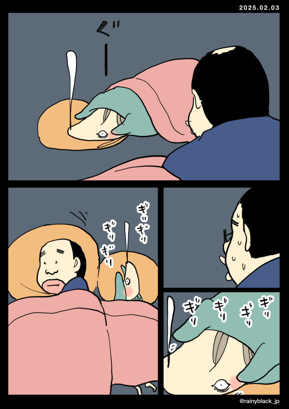 「ギリギリの毎日に。」2025 .02.03カメの着ぐるみを着たキャラクターが「じゃあね」と言って消えていく。不気味な雰囲気の中、男性が寝ていると、そのキャラクターが隣で寝ていることに気づく。男性は驚いて汗を流しながらも、キャラクターは安らかに眠っている様子で、ぎしぎしと動かないように注意を払う。状況に戸惑いつつも、動かないようにしている。僕は何があっても心が休まらない性格なのでそれはもう諦めている。僕の代わりに心穏やかでいる人間が近くにどうしても必要だ。