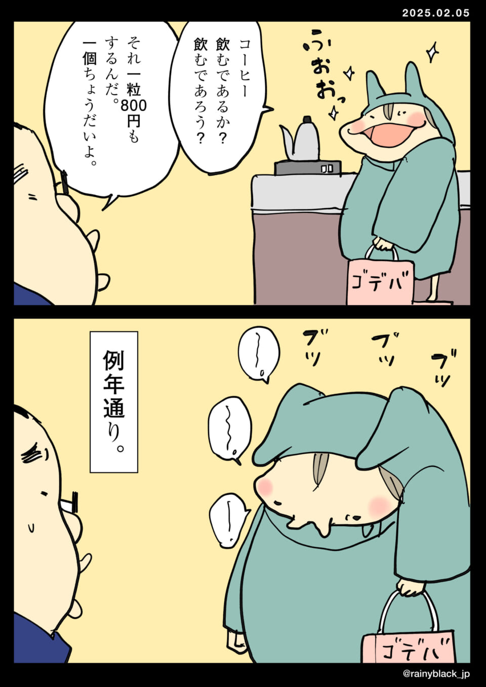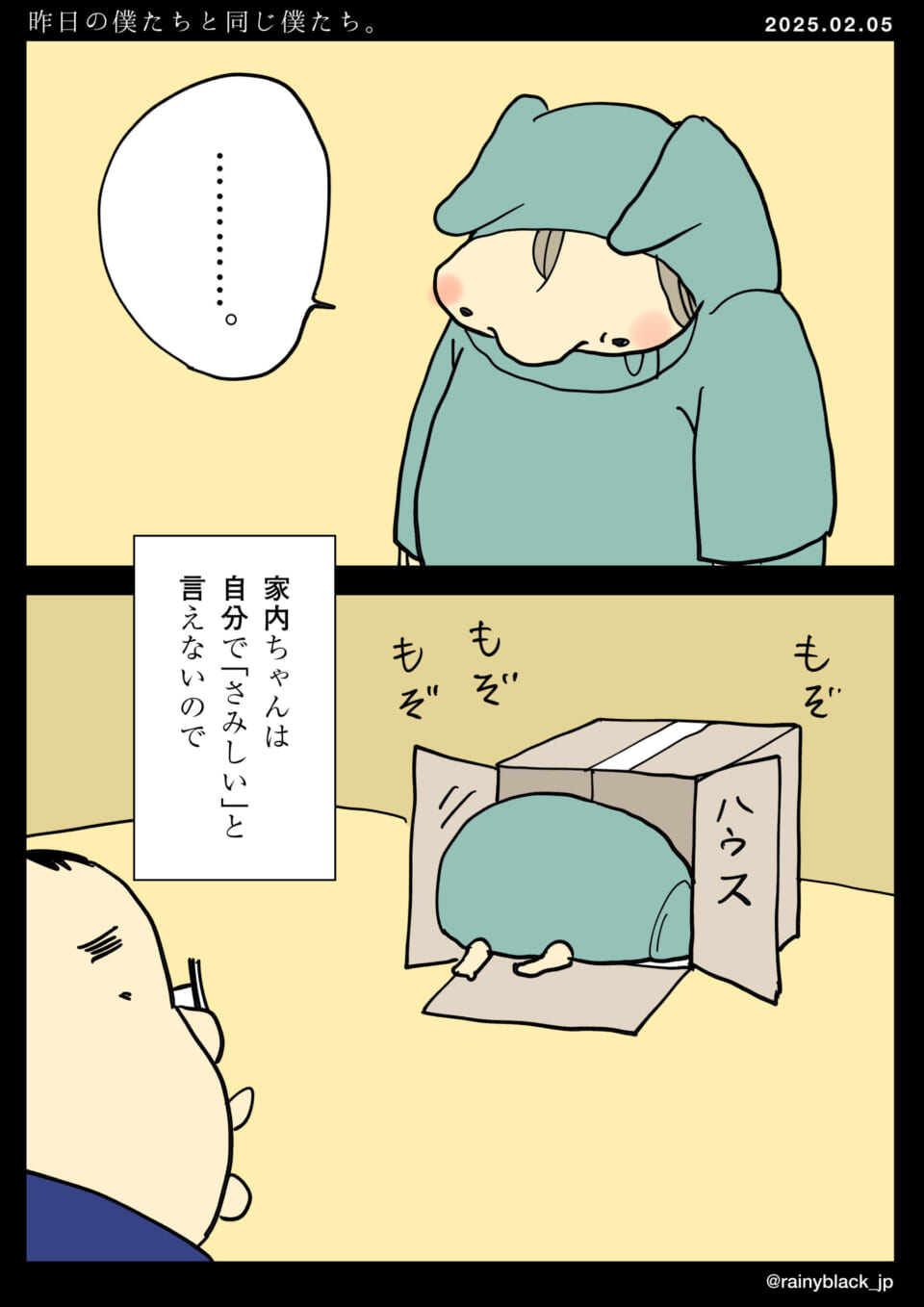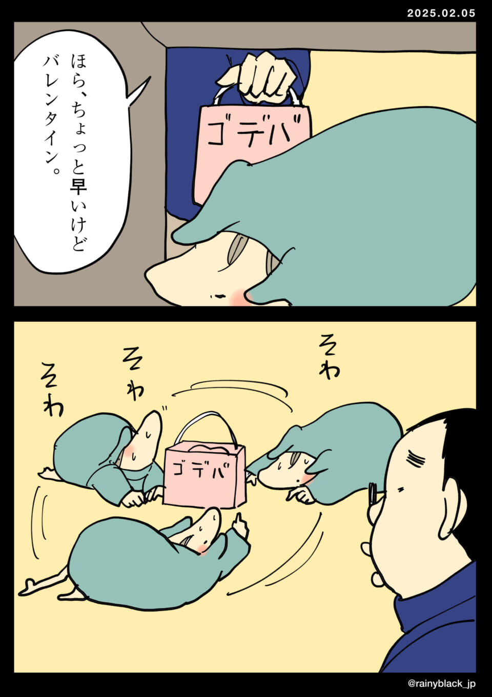 「昨日の僕たちと同じ僕たち。」2025 .02.05家内ちゃんは自分から寂しいと言えない性格である。そんな彼を慰めるために、プレゼントを渡すことにした。少し早めのバレンタインとしてゴディバのチョコレートを贈ると、家内ちゃんは大喜びである。チョコレートを手にして嬉しそうに動き回る姿に、例年通りだと感じる。そしてコーヒーを勧めると嬉しそうに飲むことになった。僕は変わらねばならないが、僕たちが変わる必要はない。