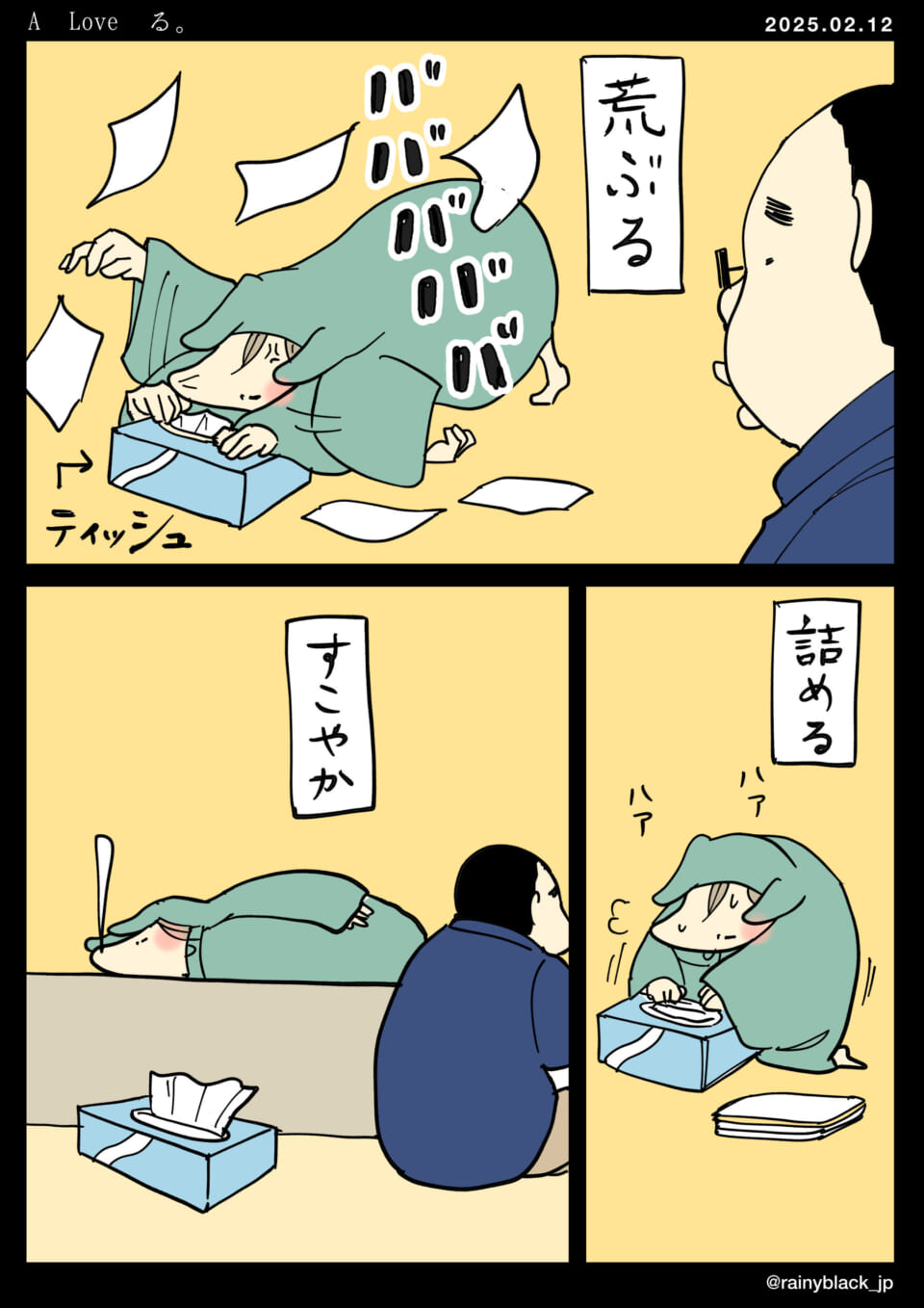 「A LOVEる。」2025 .02.12風呂敷をかぶった人物がテーブルに向かって全力でティッシュを引き抜く姿が描かれている。横には落ち着いている人が座っており、その様子を見つめている。最初は荒々しくティッシュを引き抜いていたが、その後満足して横になる。最後にティッシュを箱に詰め込んでいる。人物の行動が愉快さを増している。時にものに八つ当たりしたい時もありますが、長く生活するうちに「自分で完全修復できるもの」に八つ当たりするようになります。生活の知恵ですね。僕はフランスパンに暴力を振るい、その後食べます。