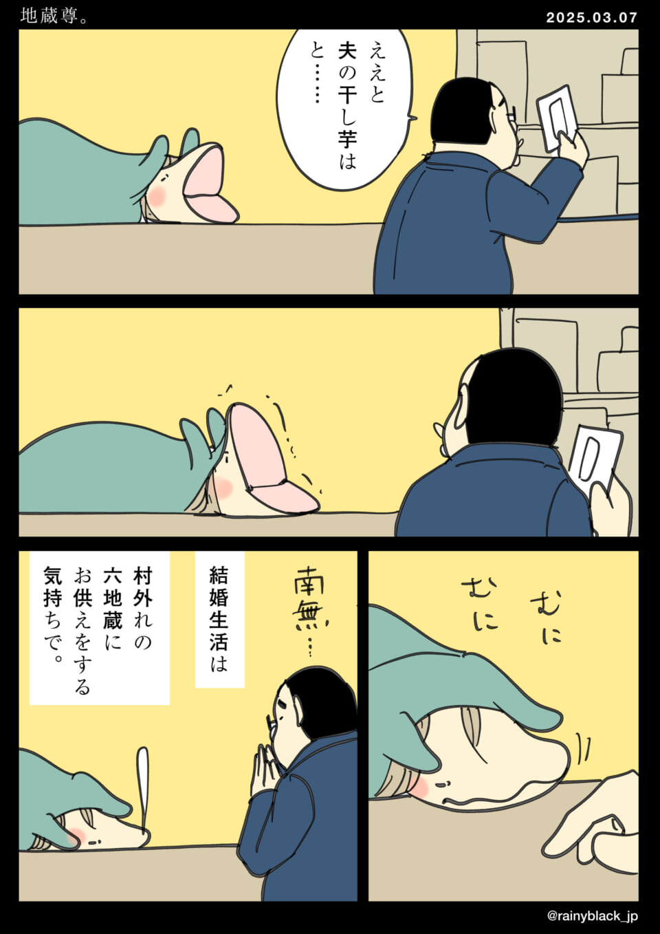 女性がカウンターで寝そべっている場面で、男性が紙を見ながら「夫の干し芋は…」と話している。この女性は「南無…」と呟きながら、村外れの地蔵への供え物のような気持ちで結婚生活をしていることを示唆している。女性の表情や姿勢から、日常生活がまるで無機質で儀式的なものと感じている様子が伝わる。全体として、現実の厳しさとユーモアを交える描写になっている。