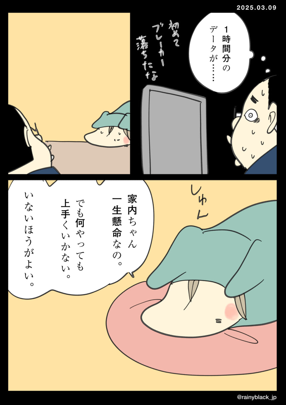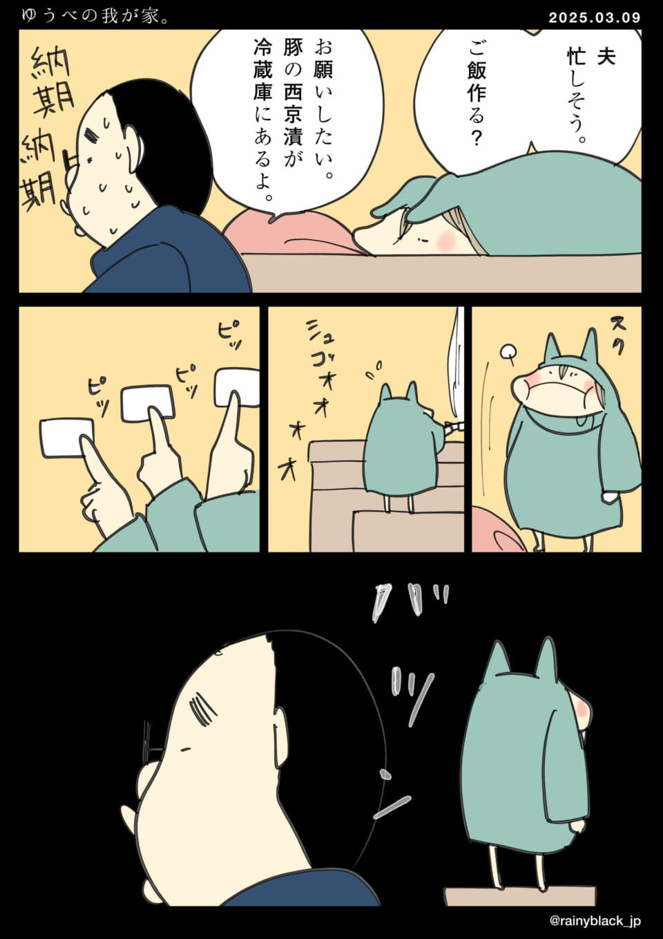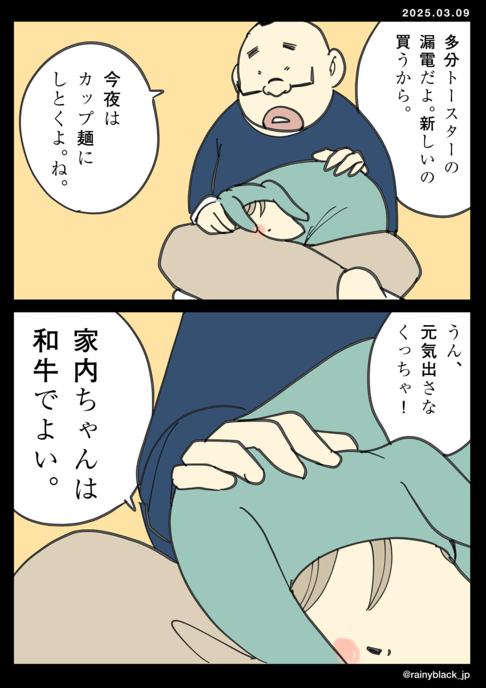 家内ちゃんは豚の西京漬を作るために一生懸命努力するが、うまくいかずに落ち込む。作業中に電子製品のブレーカーが落ちてしまい、さらに失敗としてデータも失われる。家内ちゃんは自己嫌悪に陥るが、夫は原因がトースターの漏電だろうと慰め、新しいものを買うと約束する。今夜の夕食は簡単にカップ麺にすることで落ち着かせようとする。最終的に、家内ちゃんは和牛で元気を取り戻すことを期待される。