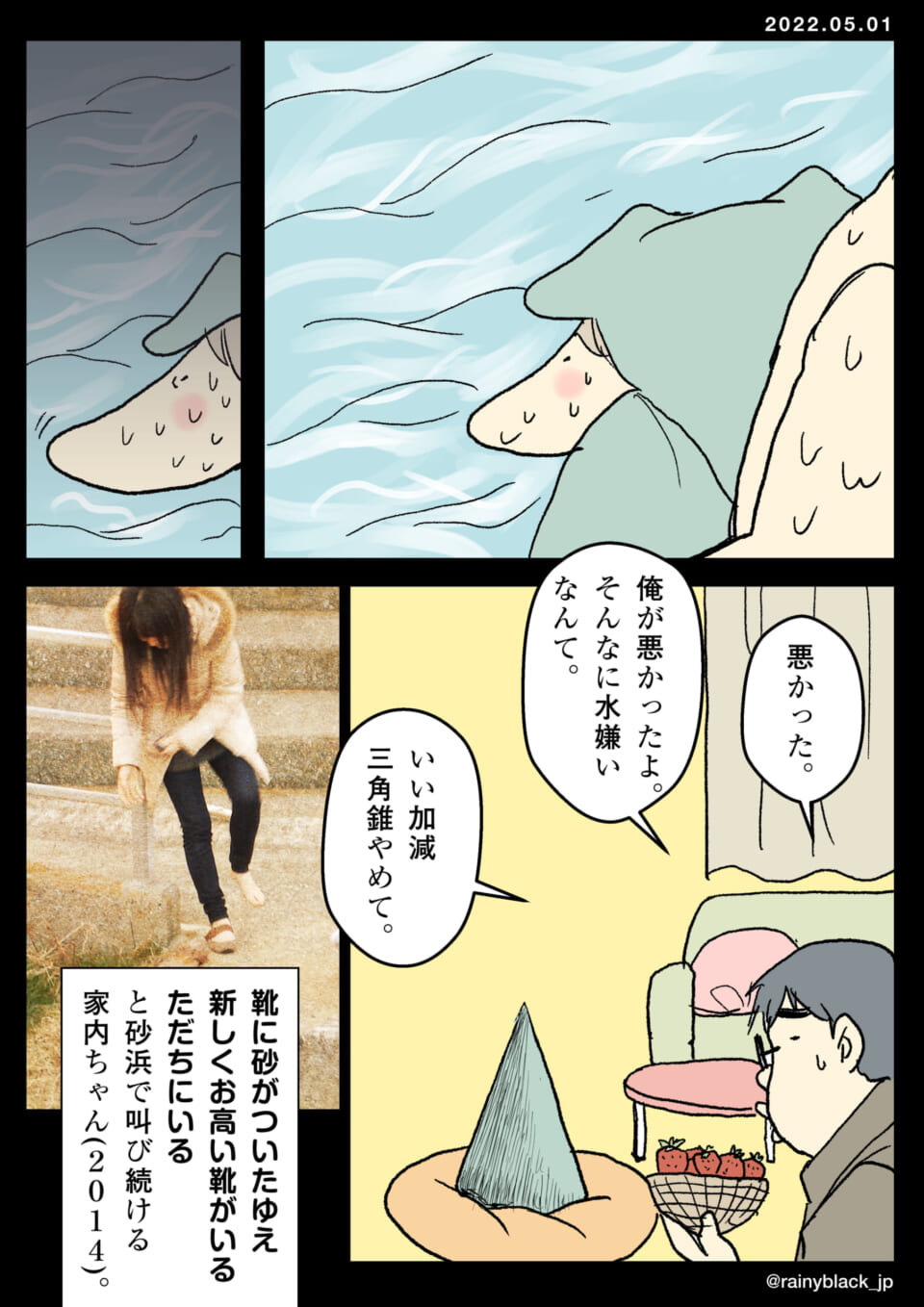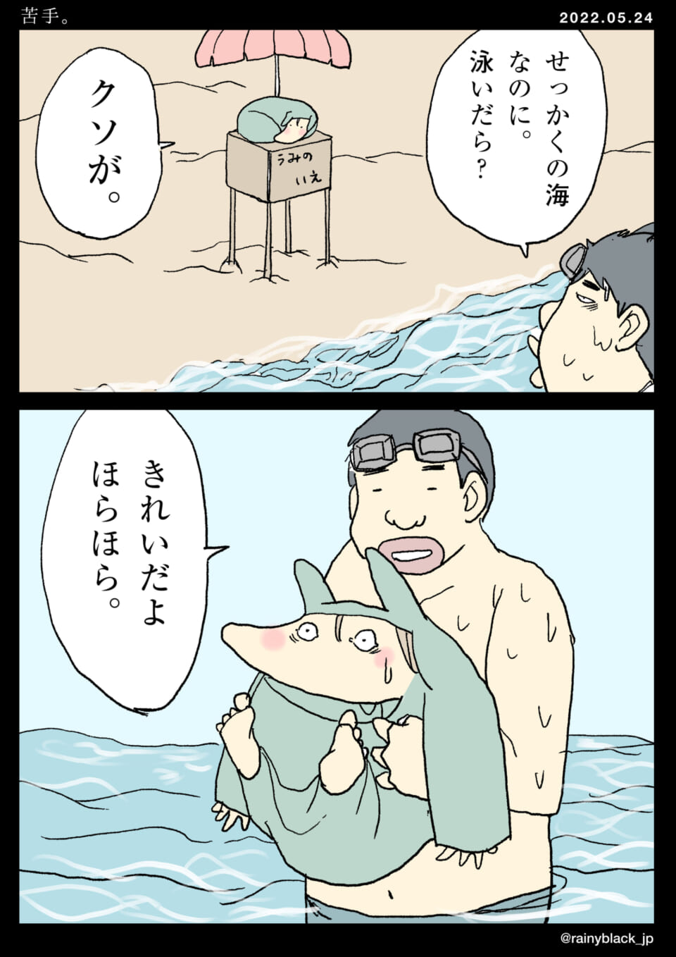 海が苦手なキャラクターが、泳ぐことを勧められて困惑している。友人に水に入れられるが、彼は水が本当に嫌いで怖がっている。その後、別のシーンで彼が家に戻り、彼の姿を見た別の友人から、三角錐の帽子をやめてほしいと言われる。過去には靴に砂が入ることを嫌がり、砂浜で不満を叫んでいた。