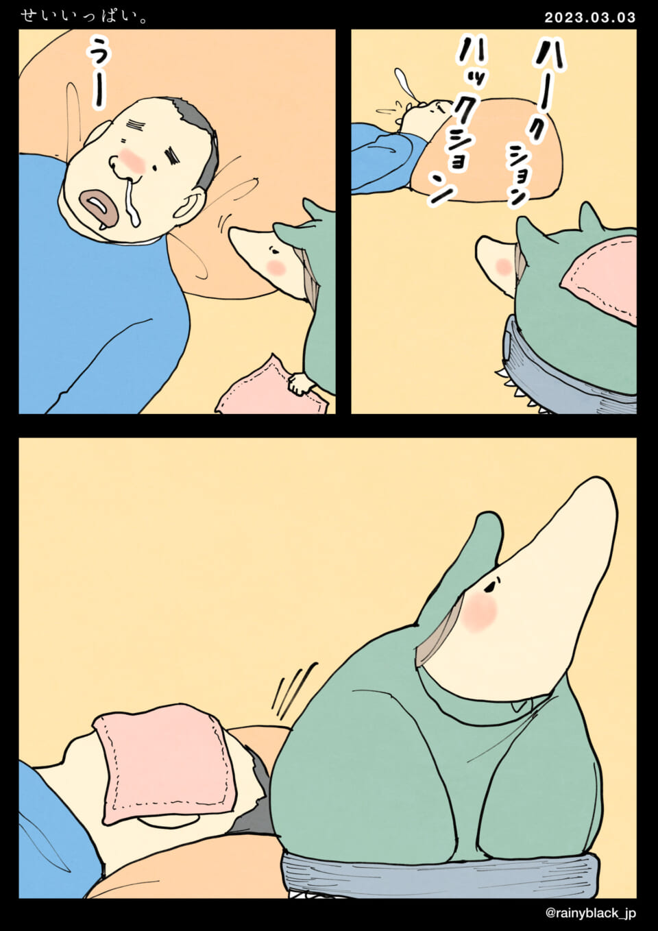 男性がベッドで寝ているところ、サメのパジャマを着たキャラクターが彼の口の上にクッションを優しく置いている。男性は大きなあくびをしているようだ。クシャミをした音も聞こえ、サメのパジャマのキャラクターの気遣いが表れているシーンだ。この絵はほのぼのとした雰囲気を描写している。