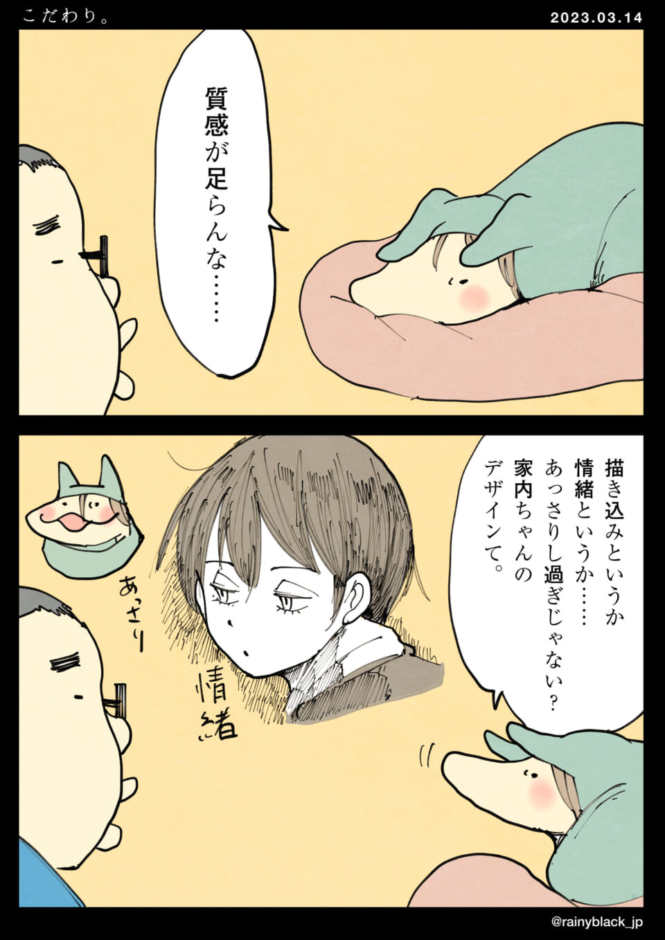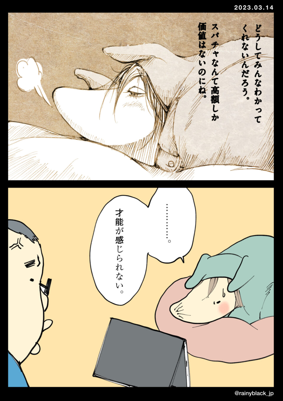 イラストを作成する人物が、自分の作品について「質感が足りない」「情緒があっさりしている」と思い悩んでいる様子が描かれている。彼は、自分の作品が高額なスパチャ(投げ銭)を受ける価値しかないことに不満を持ち、さらに「才能が感じられない」と落ち込んでいる。自らの作品に対するこだわりと、それに向けられる評価とのギャップに葛藤しているようだ。