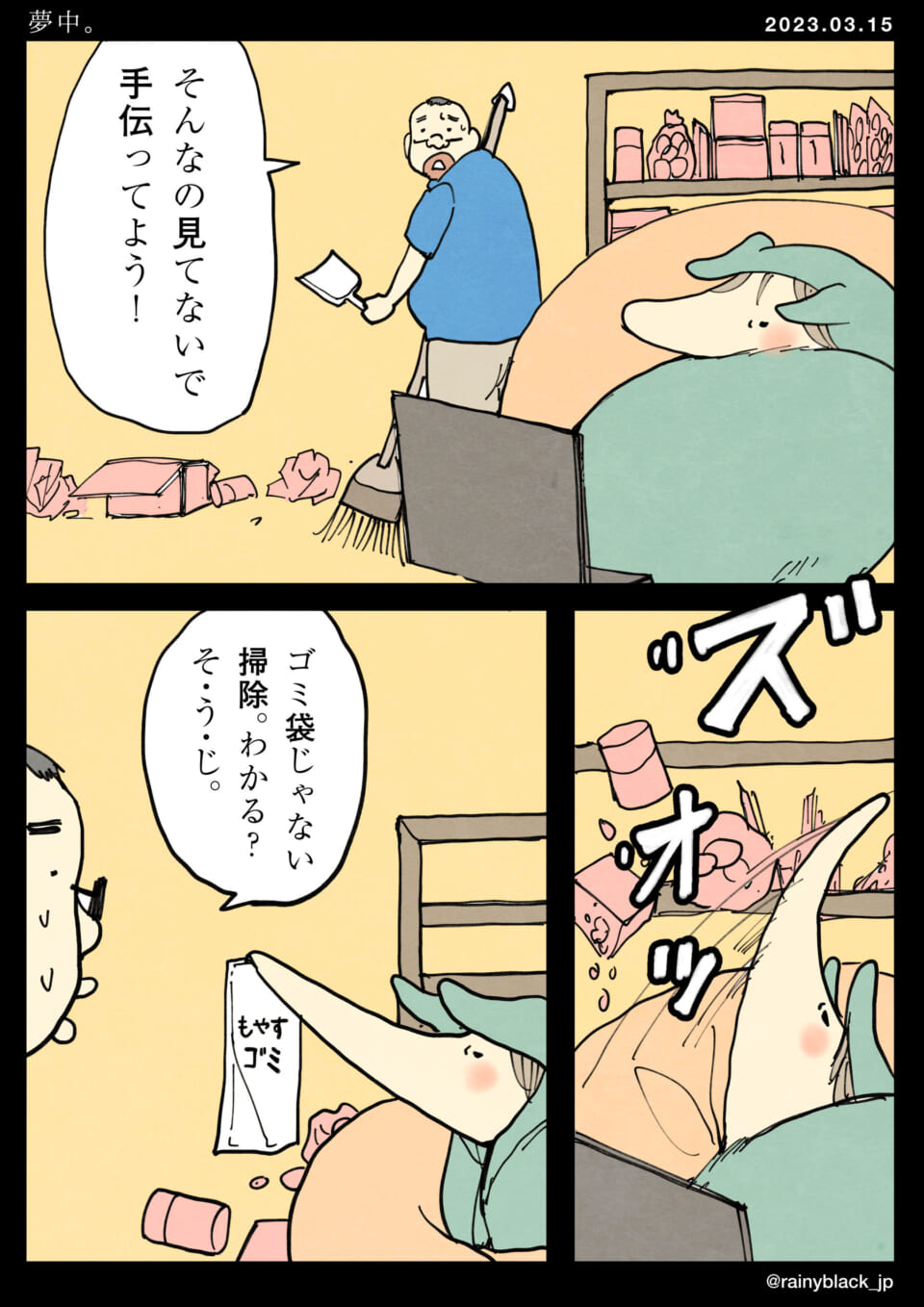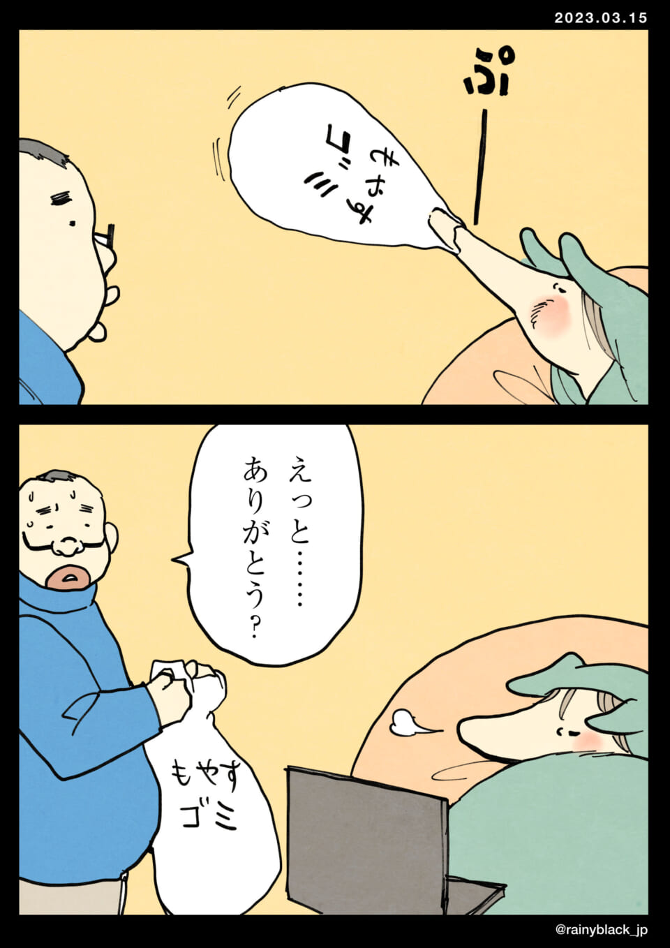 掃除をしている男性が、休んでいるキャラクターに協力を求めるが、そのキャラクターはゴミ袋を差し出すだけである。「それはゴミ袋じゃなくて掃除が必要だ」と注意されるが、結局そのまま手渡されるゴミ袋には「もやすゴミ」と書かれている。困惑した男性は感謝しつつゴミ袋を受け取るが、キャラクターは再びリラックスに戻る。