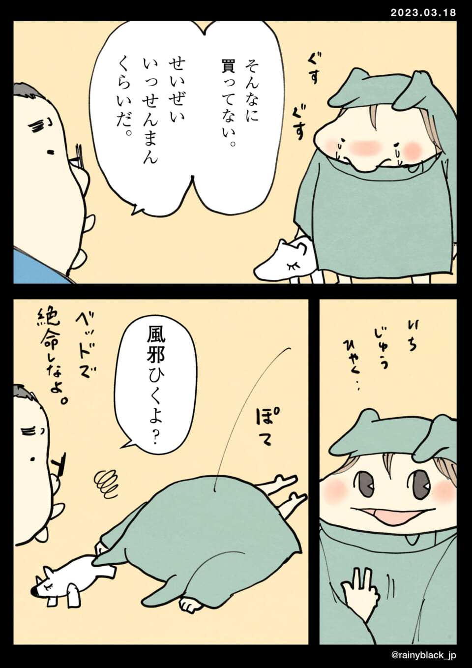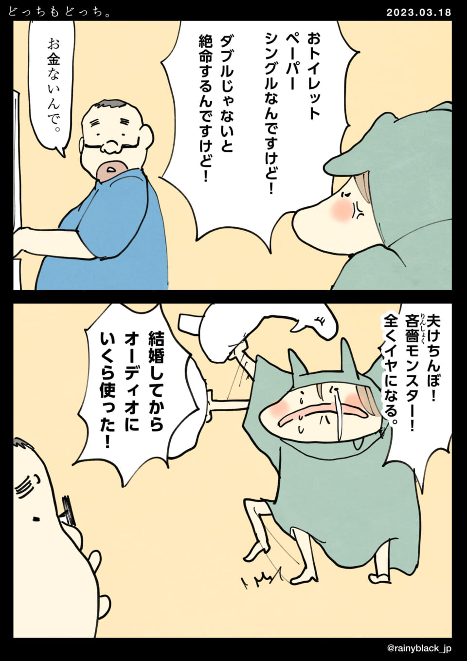 夫が家計に厳しいため、妻がトイレットペーパーについて不満を訴える。夫は支出を抑えるため、シングルのものを買う。妻はオーディオに多額を使ったことが納得できず、夫を責める。夫は高くないと言い張るが、総額は1,000万円に及ぶ。妻は腹を立てて床に倒れ込み、最後には夫の風邪を心配する様子を見せる。