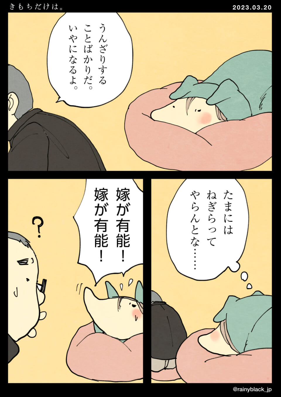 キャラクターが日常の中で疲れを感じ、「うんざりすることばかり」「たまにはねぎらってやらんとな」と独り言をつぶやく。隣にいる配偶者が反応し、「嫁が有能!」と自分自身を褒める。隣人は疑問の表情を浮かべ、終始ユーモラスなやりとりが繰り広げられている。