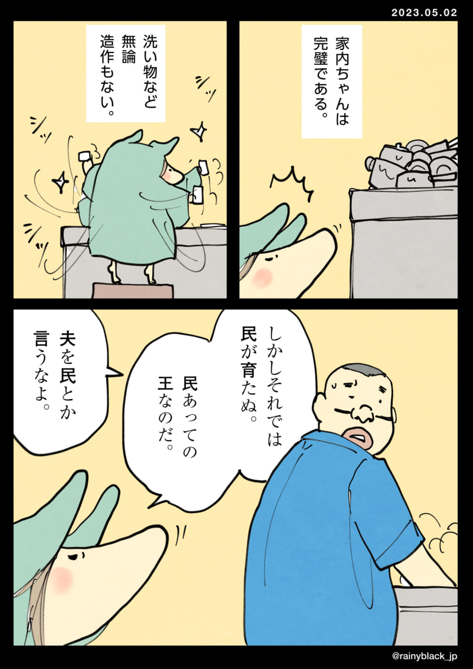ある日、家事をするように言われた夫は、洗い物を頑張っているがイマイチだと評価されてしまう。一方、あるキャラクターは自分が完璧に家事をこなしていると自負しており、洗い物などは当たり前だと主張する。民を成長させるには、王として模範を示すことが重要だと考えている。しかし、夫を「民」と呼ぶことに対して少し叱責の声も上がる。