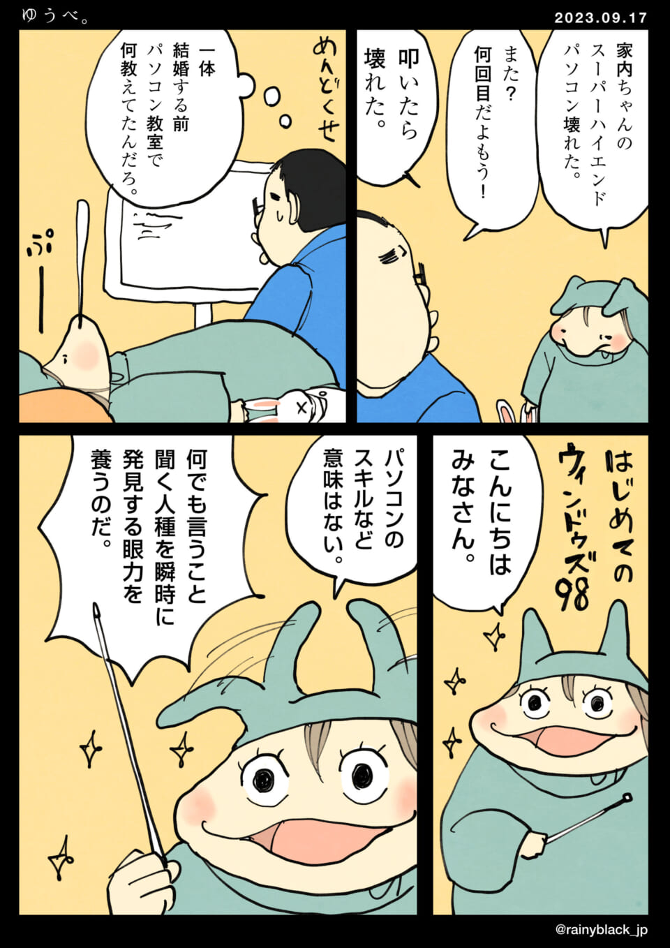 家内のパソコンがまた壊れたと嘆く夫と、それに対しやる気のない態度を示す妻が描かれている。夫は結婚前のパソコン教室で妻が何か習ったはずだと思っているが、妻はパソコンスキルには意味がないと主張している。その代わり、彼女は何でも聞く人種を瞬時に見抜く力を養うことのほうが重要だと考えているようだ。最後に、彼女はモチベーション高く、初心者向けの「はじめてのウィンドウズ98」のように見える講座を始める。