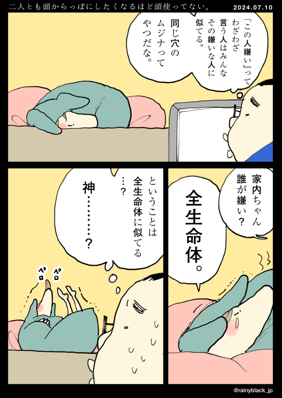 ベッドで横たわる人物が、テレビで「嫌いな人に似ている」との言葉を聞いている。同室の人物が「家内ちゃん、誰が嫌い?」と尋ねると、「全生命体」と答える。それを聞いて、同室の人物は「全生命体に似てる…?」と考え込み、さらに「神…?」という疑問が湧いてくる場面だ。テレビの発言を皮肉混じりに受け取った結果のコミカルなやり取りが描かれている。