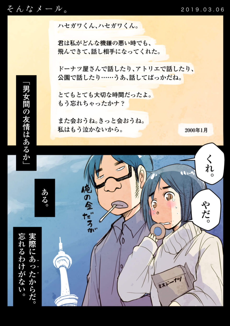 ハセガワへのメール形式のモノローグで、過去の彼との大切な時間を振り返り再会を願う。下部では、ハセガワと女性がドーナツを巡って口論。ハセガワは「俺の金だろが」と言い、女性は「やだ」と拒否。背景に東京タワー。モノローグでは「男女間の友情はあるか」という問いに「ある。忘れるわけがない」と答える。
