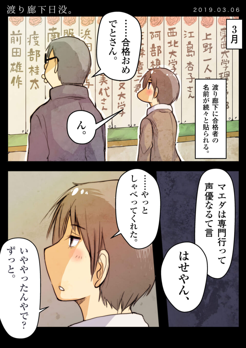 3月、渡り廊下には大学合格者の名前が次々と貼り出されている。ハセガワとマキタがそれを見ている。ハセガワは「合格おめでとさん」と声をかけ、マキタは「ん」と短く返事をする。マキタがハセガワに「はせやん、いややったんやで?ずっと。」と話しかける。ハセガワは「やっとしゃべってくれた」と内心で思う。また、ハセガワは「マエダは専門学校に行って声優になると言っていた」と回想している。