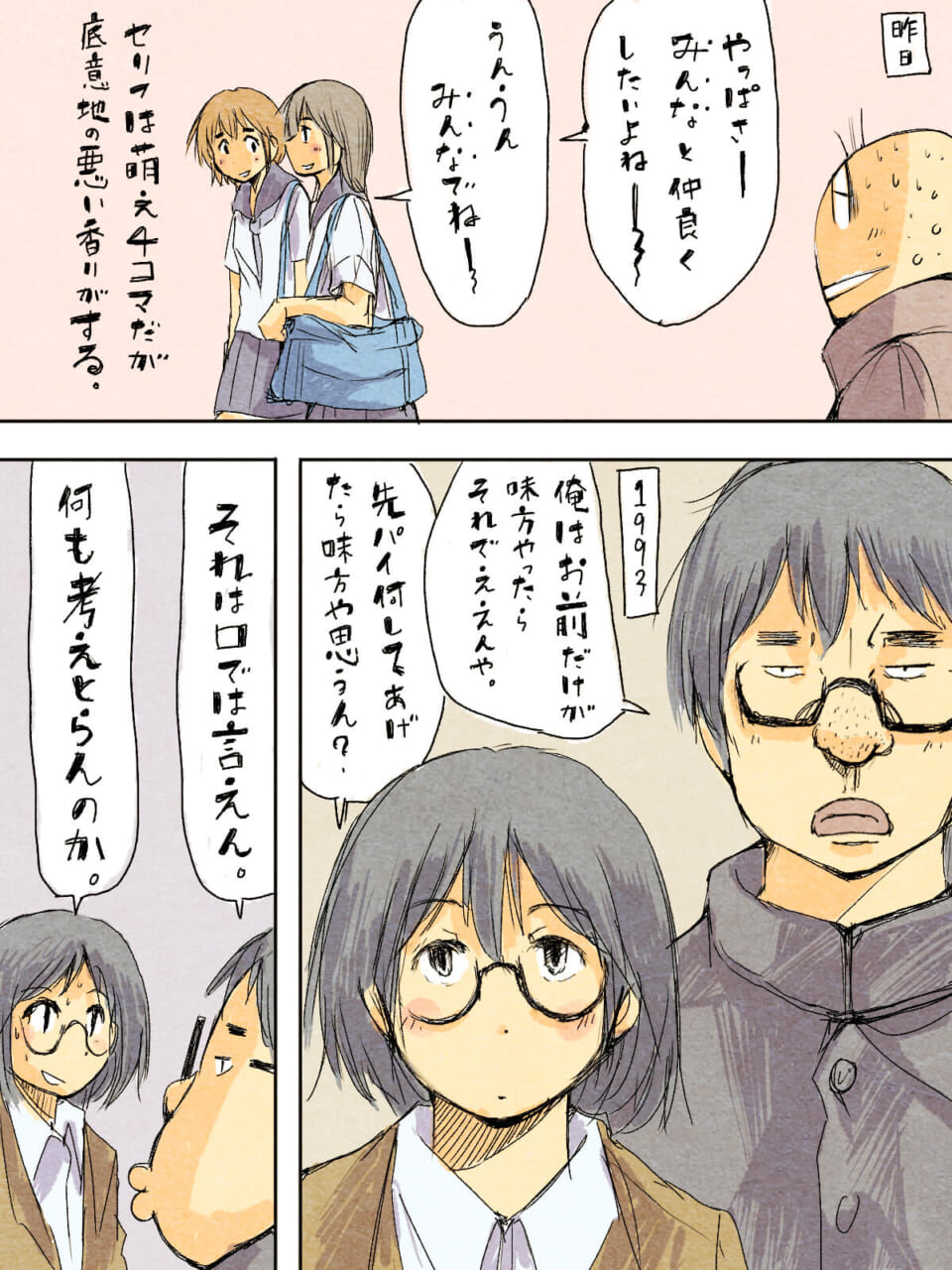 過去を回想するハセガワ。昨日の出来事として、仲睦まじく振る舞うオータニとセキグチの会話に底意地の悪さを感じ取っている。1993年の場面では、ハセガワがヨシダに対し「お前だけが味方ならそれでいい」と独りよがりな信頼を寄せるが、ヨシダは冷淡に問い返す。ハセガワは彼女の真意を測りかね、内心で葛藤する。