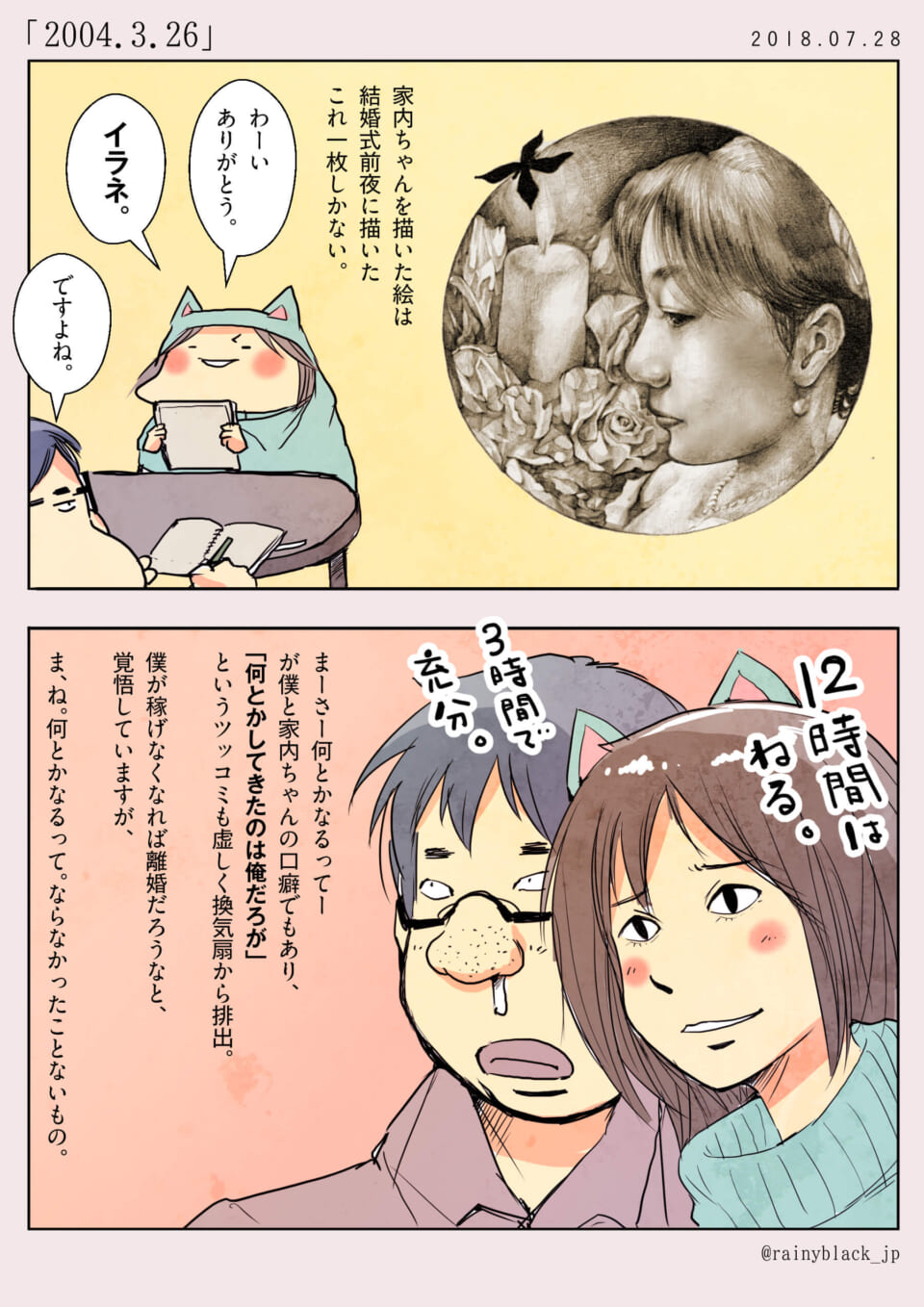 ハセガワが結婚式前夜に描いた妻の肖像画を披露するが、本人からは不要と言われてしまう。後半では、ハセガワとオータニが寄り添い、二人の共通の口癖である「何とかなる」という言葉について回想する。将来への不安を抱えつつも、これまでの歩みを肯定し、夫婦の絆を感じさせる日常の一コマである。