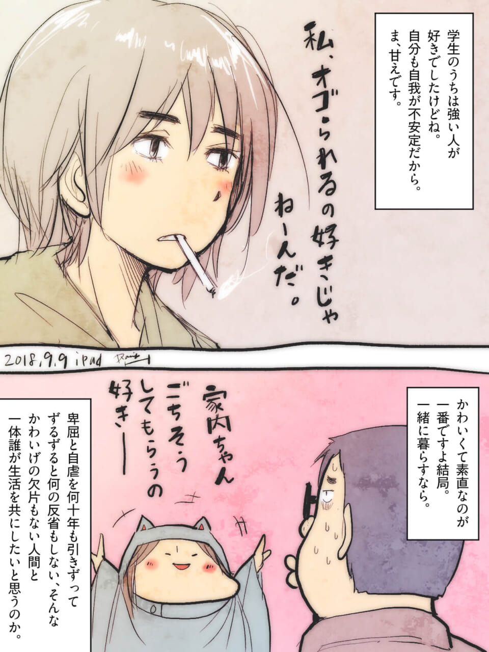 タバコをくわえたオズ先輩が、他人に奢られることを好まない自身の価値観を語る。一方で、ハセガワは素直で愛嬌のあるぴくちゃんの振る舞いを目の当たりにし、共同生活における「かわいげ」の重要性を痛感する。卑屈さや自虐を抱え続けることの難しさを、対照的な二人の姿を通して描いた日常の一コマ。