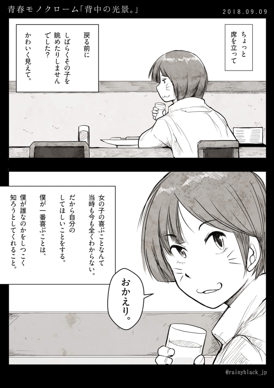 大学編の日常。ハセガワは席を立ち、戻る前にカウンターで待つ奥崎の背中をしばらく眺める。彼女の姿を可愛く感じながら席に戻ると、奥崎は「おかえり」と微笑んで迎える。ハセガワは、女の子の喜ぶことは分からなくても、自分が誰なのかを知ろうとしてくれることが一番嬉しいのだと独白する。