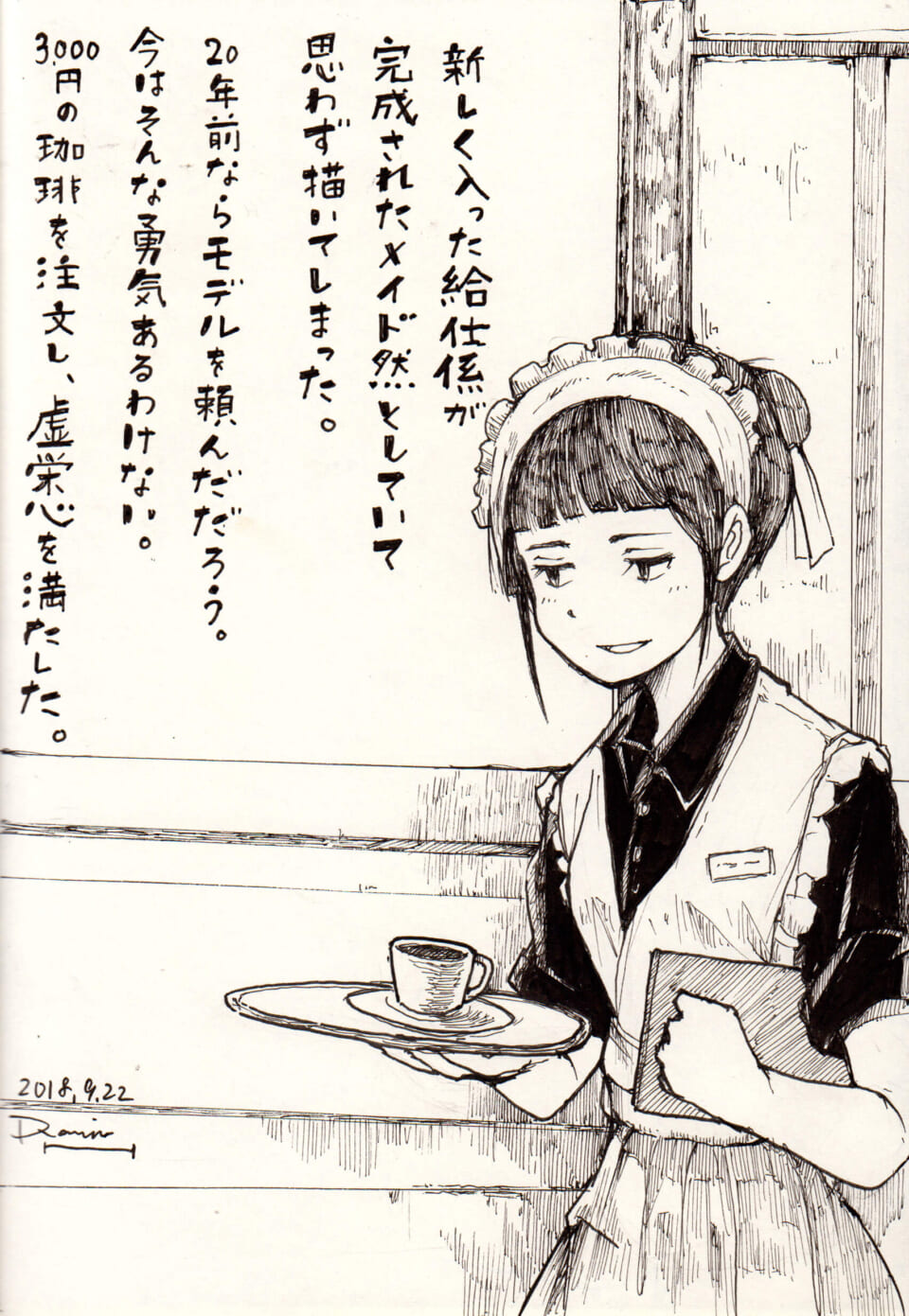 喫茶店で給仕係として働くセキグチを描いた一コマ。完璧なメイド然とした佇まいに惹かれた語り手は、思わず彼女をスケッチする。20年前ならモデルを頼めたかもしれないと過去を振り返りつつ、今の自分にはその勇気がないと独白する。3000円の珈琲を注文し、ささやかな虚栄心を満たす様子が綴られている。