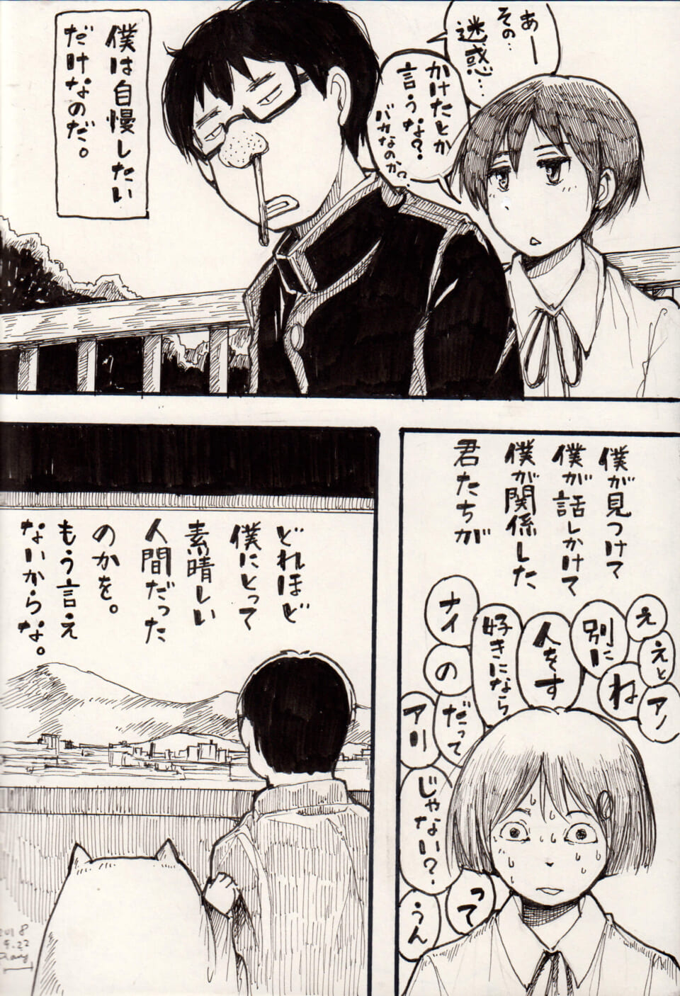 学生服のハセガワが鼻に詰め物をしながらマキタと向き合っている。マキタは淡々とした表情を浮かべ、ムロイは冷や汗をかきながら言葉を詰まらせている。ハセガワは、かつて自分が見つけ、関わった人々がいかに素晴らしい人間だったかを自慢したいのだと独白する。過去を惜しむような切ない心情が描かれている。