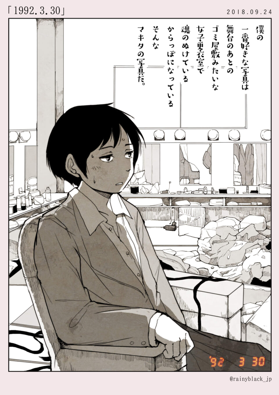 舞台公演を終えた直後、雑然とした女子更衣室で椅子に座るマキタの姿。魂が抜けたように虚脱し、からっぽな表情を浮かべている。ハセガワの視点から、この瞬間を捉えた写真が一番好きであると語られる。1992年3月30日の日付が刻まれた、青春の一幕を切り取った切なくもビターな1ページ。