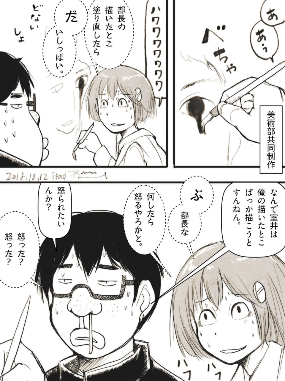 美術部の共同制作中、ムロイは部長であるハセガワが描いた箇所を塗り直して失敗してしまう。ハセガワは困惑し、なぜ自分の場所ばかり描こうとするのかと問う。ムロイは内心で、どうすればハセガワが怒るのか試そうとしていたことを明かす。二人の噛み合わないやり取りと思春期の不器用な交流が描かれている。