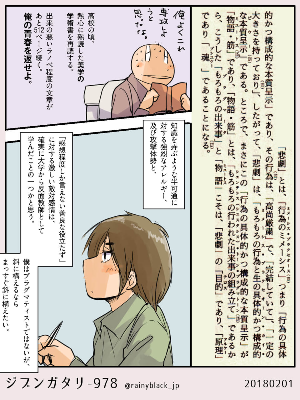 ハセガワは高校時代に熟読した美学の学術書を再読し、当時の自分や文章の質に辟易しながら「青春を返せ」と独白する。知識をひけらかす者や、中身のない感想しか言えない者への強い嫌悪感は、大学時代の経験から来ていると分析する。記憶の中のオータニが微笑む一方で、ハセガワの屈折した内面が綴られる。